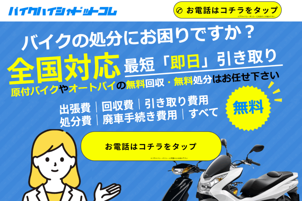 「バイクハイシャドットコム」は、動かないバイクや事故車・不動車の買取に特化したサービスです。レッカーが必要な車両でも無料で引き取り対応してくれるため、処分に困っているバイクを手軽に現金化できます。